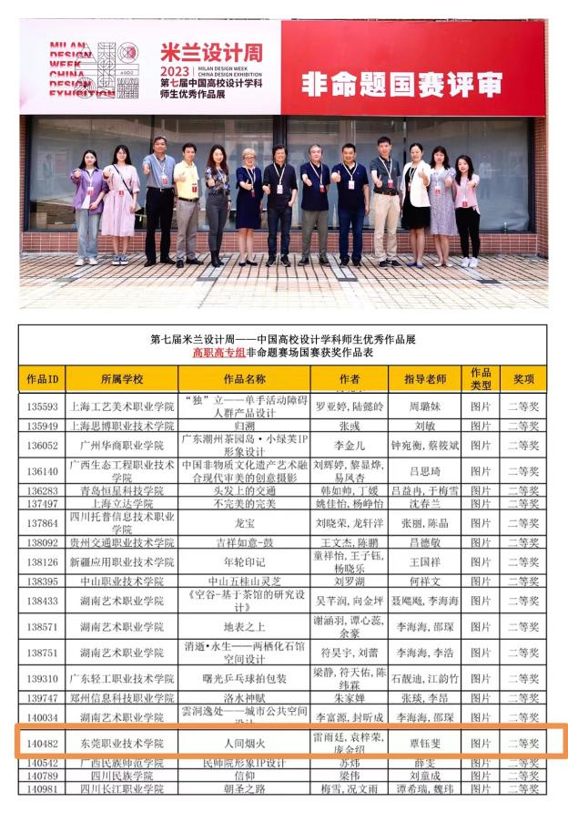 近日,由中国高等教育学会指导主办的2023年第七届米兰设计周——中国高校设计学科师生优秀作品展公布获奖名单,创意设计学院教师覃钰斐获得专业组全国赛区二等奖及广东省赛区一等奖,由其指导的学生雷雨廷、袁梓荣、庞金绍获得学生组国赛二等奖及省赛二等奖。由刘梦、赵佳老师指导的学生廖仲演、周梓华分别获得学生组省赛二等奖和三等奖。