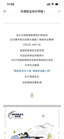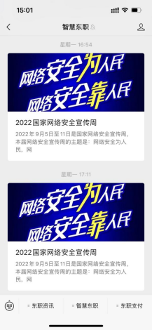 线下主要通过图书馆大屏幕轮巡播放网络安全宣传视频,校园主干道张贴网络安全海报和横幅,为师生发放网络安全宣传小册子;线上通过学校官微以及“智慧东职”公众号,推送网络安全小知识,让师生学习《网络安全法》、《数据安全法》和《个人信息保护法》,让师生了解相关法律法规,加强网络安全意识。