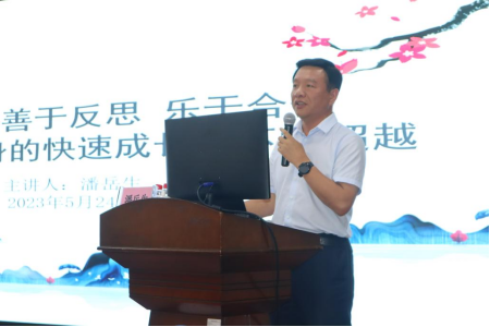 原岳阳职业技术学院院长潘岳生教授,为老师们主讲题为“勤于学习、善于反思、乐于合作、努力实现自身的快速成长和不断超越”的讲座。潘岳生教授结合自身经历、引经据典,分别从“勤于学习——站在前人的肩膀上前行”、“善于反思——站在自己的阶梯上攀升”、“乐于合作站在团队的翅膀上翱翔”三个方面阐述如何突破自我,不断成长。潘教授鼓励年轻老师们要保持终身学习的习惯,有勇于挑战自己的决心和行动,才能不断成长,在工作中有所作为。潘教授以生动平实的语言分享自己学习的见解,对学院老师们颇有启发,点燃了老师们奋发向上、争先创优的热情。